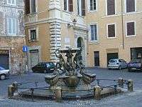 The Fontane delle Tartarughe (The Turtle Fountain) is a fountain of the late Italian Renaissance, located in Piazza Mattei, in the Sant'Angelo district of Rome, Italy. It was built between 1580 and 1588 by the architect Giacomo della Porta and the sculptor Taddeo Landini. The bronze turtles around the upper basin, usually attributed either to Gian Lorenzo Bernini or Andrea Sacchi, were added in either 1658 or 1659 when the fountain was restored.
