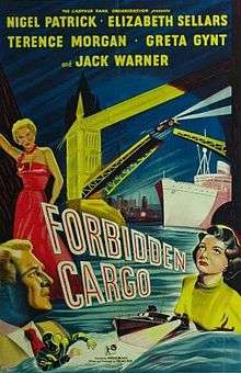 Forbidden Cargo is a 1954 British crime film, directed by Harold French[3] and starring Nigel Patrick, Elizabeth Sellars and Jack Warner.[3]