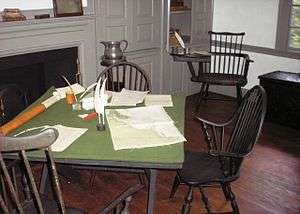 Washington wrote many letters to congress explaining the poor predicament that his troops were in during his stay at the Ford Mansion. His place of work was in the private study, which was located on the first floor of the house.[17] Washington's aides-de-camp worked in the parlor, which became the military office. These included Alexander Hamilton, Robert H. Harrison, Tench Tilghman, Richard Meade and James McHenry.[18] According to Pfister, the only record of Washington's stay at the mansion was a letter from Richard Meade to Mrs. Ford, dated July 26, 1780. The letter has been transcribed in the Library of Congress and reads:
