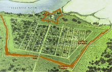 The colony had many early growing pains that included a harsh seasoning period when many settlers died, struggles over whether to admit slaves, conflicts with South Carolina over fur trading rights, and disputes over everything from legalization of rum consumption to land rights. Still, Oglethorpe was quite adept at using his Native American neighbors to facilitate the colony's initial success.[74] He was also quite savvy at using previous history as a guide. Oglethorpe knew he had to establish a successful settlement on the Altamaha and the surrounding areas. In 1735 he had Captain George Dunbar visit the ruins of Fort King George. Though his report on the site is vague (it only talks about surveyor lines being laid out, probably done so by the soldiers earlier at Fort King George), Oglethorpe's later actions demonstrate his unhappiness with the site.[75] Oglethorpe ordered the Highlanders to land at "Barnwell's Bluff", but later moved the settlement about 1 mile (2 km) farther up-river, probably due to the periodic flooding of the bluff and its proximity to the marsh, something attributable to malarial outbreaks in this time period Also, though it is not stated in records, it stands to reason that Oglethorpe was familiar with the earlier hardships endured at Fort King George. He may even have read Barnwell's journal and other records indicating the difficulties of settling the site on the Altamaha. The intense climate and harsh natural surroundings along the Altamaha, coupled with history, compelled Oglethorpe to seek a resilient group of people to settle the area. Also, he knew he had to use good logistics in how he established his fortification system along this vast stretch of coast, and that the Altamaha settlement would be a crucial cornerstone of his system.[76]