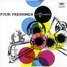 Four Freshmen and 5 Trombones is a 1955 album by The Four Freshmen.[1] The band was a major seller during the 1950s. "It reached number six nationally and resided on the charts for over eight months."[2] This was the first trombone album to reach the top ten. It was the first album bought by Brian Wilson, who would be greatly influenced by the Four Freshmen when starting The Beach Boys.[3]