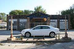 The Four Nineteen Building is a historic gas station building located at 419 E. 83rd St. in the Chatham community area of Chicago, Illinois. The station was built in 1928 by William D. Meyering and David L. Sutton, two local real estate businessmen. The station is an example of the Domestic style of gas station architecture, in which stations were designed to resemble small houses. A wooden canopy supported by brick piers covers the building's front entrance and two garage bays extend from either side, making the station part of a subtype of the Domestic style appropriately named "House with Canopy and Bays". The station's walls are built with clinker bricks laid in a skintled pattern, a combination of two Chicago construction innovations. Clinker bricks were heated at higher temperatures than standard bricks, making them swollen, dense, and differently colored; the bricks were generally discarded until the 1920s, when Chicago architects began to build with them. The skintled pattern of brickwork consisted of rough and irregular bricklaying in which bricks stuck out of and into the wall at different angles. The building's parapet roof is tiled with multicolored Mission style clay tiles, which were thought to pair well with skintled walls by architects of the era. Gas stations constructed from the 1930s onward generally had more functional designs, and as of 1999, the Four Nineteen Building was one of only sixteen Domestic-style gas stations remaining in Chicago and one of three with both a canopy and bays.[2]