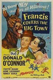 Francis Covers the Big Town is a 1953 American black-and-white comedy film from Universal-International, produced by Leonard Goldstein, directed by Arthur Lubin, and starring Donald O'Connor, Yvette Duguay, and Gene Lockhart. The distinctive voice of Francis is a voice-over by actor Chill Wills.