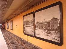 Walls of the underground station decorated with historic photographs, including of the old station building