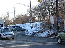 From the intersection, County Route 507 continues north through North Arlington, crossing a mix of industrial, commercial and residential residences as it parallels the Passaic River. Soon after, the route passes the local football and baseball fields, approaching the waterfront of the Passaic. County Route 507 soon passes a waterfront park and curves to the northeast away from the Passaic at Riverside County Park. Near the intersection with Bergen County Route 26 (Jauncey Avenue), the route curves to the northwest and becomes Riverside Avenue. County Route 507 continues to parallel Riverside County Park until Park Street, where the park terminates, and after entering Lyndhurst, the highway intersects with County Route 28 (Kingsland Avenue, opposite Park Ave Bridge over the Passaic River).[1][3] County Route 507 continues northward along Riverside Avenue, passing residences and a large local park before intersecting with County Route 30 (Park Ave)[1] at a fork in the roadway. The route first heads northward and reaches the Passaic River waterfront, where it turns to the northeast and parallels the river before crossing under New Jersey Transit's Main Line. County Route 507 enters Rutherford after crossing County Route 30 (Rutherford Avenue), County Route 507 than intersects with New Jersey Route 3 westbound at a partial cloverleaf interchange. There is no interchange for Route 3 eastbound along County Route 507, which continues along the Passaic riverside through a largely residential area. At the intersection with Donaldson Avenue, Route 507 becomes known as Jackson Avenue. After making a skip to the northeast, the road turns back to the northeast through a wooded residential district. At the intersection with County Route 34 (Union Avenue), County Route 507 passes some commercial businesses, but remains highly residential afterwards.[2] After the intersection with County Route 32 (Erie Avenue), the highway crosses the former Erie Railroad main line and the site of the former Carlton Hill station. Soon after, County Route 507 passes the former Royce Chemical Standard and Bleachery,[4] where it changes names to Carlton Avenue for entering East Rutherford.[2]