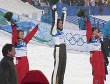 Flower ceremony for the winners of the Women's Aerials. From left: Li Nina (silver), Lydia Lassila (gold) and Guo Xinxin (bronze) | ||||||||||