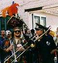The French Quarter neighborhood of New Orleans, Louisiana is the center of the city's Carnival celebrations, especially on Mardi Gras Day. This part of town is crowded with both tourists and locals, with the former more numerous in the Upper Quarter, the latter in the Lower Quarter. There are numerous parties and more than one costume contest. While the large motorized floats of the big parades have been prohibited since the early 1970s from going down the Quarter's narrow streets, numerous small marching krewes, parading jazz bands, and groups of revelers converge here. Some krewes parade in the Quarter after starting earlier in the day in other parts of town.