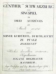 Günther von Schwarzburg is a Singspiel in three acts by Ignaz Holzbauer set to a German libretto by Anton Klein. Loosely based on events in the life of the 14th-century German king, Günther von Schwarzburg, the opera premiered on 5 January 1777 at the Hoftheater in the Mannheim Palace.