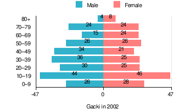 Figure 1. Population pyramid of village in 2002 – by age group and sex[1]