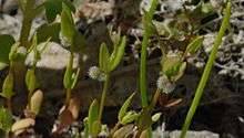 Galium bifolium is an annual herb standing erect to a maximum height of about 15 centimeters. Leaves grow in whorls of four divided into two pairs. The foliage is hairless and sometimes slightly fleshy. The solitary flowers have three white tepals and the fruit is a round nutlet covered in shiny white hairs.[3]