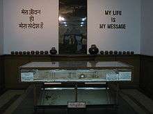 The National Gandhi Museum Gallery has a large number of paintings and personal items of Mahatma Gandhi. The most notable items in the collection are a Satyagraha woodcut by Willemia Muller Ogterop, one of Gandhi's walking sticks, the shawl and dhoti worn by Gandhi when he was assassinated, one of the bullets that were used to kill Gandhi and his urn.[5] The Museum also displays some of Gandhi's teeth and his ivory toothpick.[6]