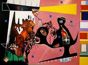 Best known for introducing new themes and subject-matter into Australian art and being one of the first Australian artists to be influenced by Pop art, particularly British Pop artists like Peter Blake, Allen Jones, Derek Boshier, Joe Tilson[2] and the formal strategies of the post-modernist R. B. Kitaj. Another major Influence was and remains the British painter Francis Bacon. He was an associate of Brett Whiteley and there was a likely mutual influence. Sansom has had a distinct influence on subsequent Australian art, paving the way for later notable artists such as Juan Davila and Howard Arkley. His work is represented by the National Gallery of Australia, the National Gallery of Victoria, the Art Gallery of New South Wales, the Metropolitan Museum of Art, New York and the Mertz Collection. His paintings are eclectic, studded with allusions both historical, cultural and personal. There is something almost diaristic about his work, but its presentation is anything but linear and logical. Abiding themes are mortality, ageing, sexual identity, popular and youth culture and cinema. There is also a strong element of humour, iconoclasm and irony in his work, from their titles, such as "Art Can't Fart (for Rose Selavay)", "Four Wise Men Looking for God in Abstract Art", "Dr Fu Manchu's Death by Gyro" or "Ship of Fools (Hello sailor!)" to comic and grotesque figurative elements and their sometimes lurid but highly resolved colour schemes. On a technical level his paintings combine oils, enamels (both sprayed and applied with brush) and collaged elements from personal photographs to objects stuck on or painted over. Stylistically Sansom uses a wide array of painting techniques but signature devices include allowing earlier layers of paint to remain visible, hard-edge geometric shapes juxtaposed with playful, lyrical, more organic or atmospheric passages of paint and figurative "doodles", often at the margins of the paintings.