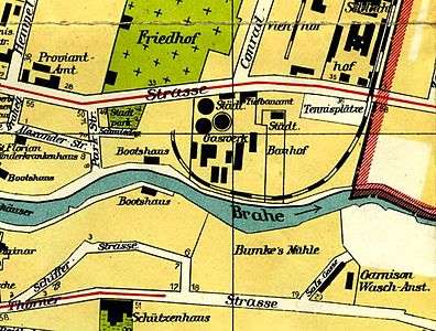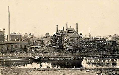 The Gasworks company of Bydgoszcz is one of the oldest in Poland. The building was built in 1859, on a selected area of the Brda river, and it was placed into active service on October 1, 1860, when the city was part of Prussia.[1] The choice of the location was done so that it was possible to bring coal by waterways from the Vistula River or the Bydgoszcz Canal. The power plant was located on the former eastern outskirts of the city. The gas was produced by the combustion of coal, hence its name Coal gas, or "town gas". During the first 20 years of its existence, during which the city became part of the German Empire, the gasworks produced exclusively for street lighting:[2] in 1860, 285 gas lighting appeared in Bydgoszcz city, replacing kerosene lamps, and illuminating most important places (offices, hotels). In 1910, 1488 lamp posts were using "town gas", with an automatic switch-on system running since 1900.