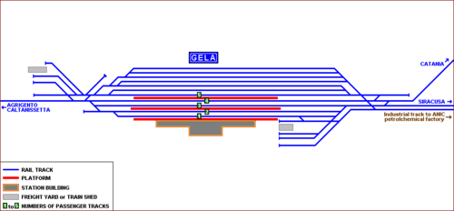 Gela station has a modern one-floor building, in front of a large parking and bus terminus. It counts 3 platforms and a total of 11 tracks: 5 are used for passenger cars and the other 6 for goods wagons. Due to this reasons, Gela is the greatest middle station of the line from Syracuse to Agrigento and Caltanissetta, and one of the most important hubs for freight traffic in Sicily.