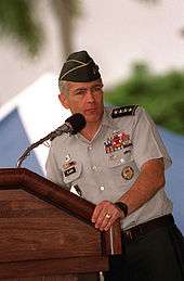 Army regulations set a so-called "ticking clock" upon the promotion to a three-star general, essentially requiring that Clark be promoted to another post within 2 years from his initial promotion or retire.[47] This deadline ended in 1996 and Clark said he was not optimistic about receiving such a promotion because rumors at the time suggested General Dennis Reimer did not want to recommend him for promotion although "no specific reason was given".[48] According to Clark's book, General Robert Scales said that it was likely Clark's reputation of intelligence within the military was responsible for feelings of resentment against him from other generals. Clark was named to the United States Southern Command (USSOUTHCOM) post despite these rumors. Congress approved his promotion to full general in June 1996, and General John M. Shalikashvili signed the order. Clark said he was not the original nominee, but the first officer chosen "hadn't been accepted for some reason."[48][49]