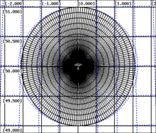 The picture to the right shows an example radar projection with the center of projection (COP) at latitude 50.0° and longitude 0.0° which is also the radar position. The dashed lines are the equal-latitude and equal-longitude lines on top of the background map. The solid lines show equal-range and equal-azimuth with the respect to the radar position. It is a feature of the radar projection that equal-range lines are circles and equal-azimuth lines are straight lines. This is necessary to display radar video consistently with other map data when using a radar projection where the projection center has to be the radar position.