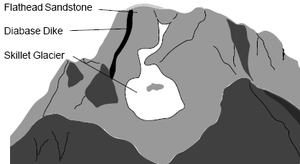 Sometime around 2,500 million years ago, blobs of magma intruded into the older rock, forming plutons of granitic rock.[3] Extensive exposures of this rock are found in the central part of the range. About 1,300 to 1,400 million years ago in Late Precambrian, 5 to 200 foot (1.5 to 60 m) thick black diabase dikes intruded as well, forming the prominent vertical dikes seen today on the faces of Mount Moran and Middle Teton (the dike on Mount Moran is 150 feet (46 m)).[3][4] Some of the large dikes can be seen from the Jenny Lake and String Lake areas.