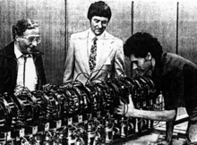 One of SSI's first grants funded the development of the mass driver, a device first proposed by O'Neill in 1974.[47][48] Mass drivers are based on the coilgun design, adapted to accelerate a non-magnetic object.[49] One application O'Neill proposed for mass drivers was to throw baseball-sized chunks of ore mined from the surface of the Moon into space.[50][51] Once in space, the ore could be used as raw material for building space colonies and solar power satellites. He took a sabbatical from Princeton to work on mass drivers at MIT. There he served as the Hunsaker Visiting Professor of Aerospace during the 1976–77 academic year.[52] At MIT, he, Henry H. Kolm, and a group of student volunteers built their first mass driver prototype.[32][43][47] The eight-foot (2.5 m) long prototype could apply 33 g (320 m/s2) of acceleration to an object inserted into it.[32][43][50] With financial assistance from SSI, later prototypes improved this to 1,800 g (18,000 m/s2), enough acceleration that a mass driver only 520 feet (160 m) long could launch material off the surface of the Moon.[43]