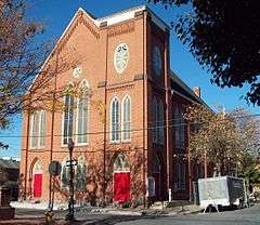 German Evangelical Zion Lutheran Church, now known as Tabernacle Baptist Church, is a historic Lutheran church at Capital and Herr Streets in Harrisburg, Pennsylvania. The church was built in 1886, and is a two-story brick building in a modified Gothic style. It features a three-story square bell tower with large oval windows and brick tracery. Attached to the church by a one-bay, two-story section is a three-story brick parsonage built in 1897.[2]