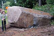 | "Granite" is a 6-by-7-by-4.5-foot (1.8 m × 2.1 m × 1.4 m), 30,000-pound (14,000 kg) granite boulder discovered "under a bunch of sticker bushes" during an October, 2015 construction project in Edmonds. After attempts to destroy the boulder resulted in destruction of the power equipment used, the city offered it for free to a city resident who would accept it on their property.[11][12] | |