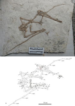 The holotype, IG-CAGS-08-07, includes the almost complete skull, the lower jaws, the front neck vertebrae and part of a hindlimb.[1] In 2016, a second specimen was referred, JPM 2014–004, a juvenile from the Jiufotang Formation. It represents an almost complete skeleton, missing only the left hindlimb, the rear back vertebrae, the sacrum and the tail. Though the holotype was originally considered an adult, the new exemplar indicates that IG-CAGS-08-07 was a juvenile also.[2]