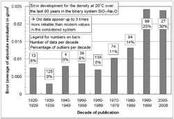 Decreasing accuracy of modern glass literature data for the density at 20 °C in the binary system SiO2-Na2O.[12]