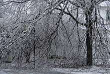 Glaze ice or simply glaze,[1] also called glazed frost, is a smooth, transparent and homogeneous ice coating occurring when freezing rain or drizzle hits a surface.[2] It is similar in appearance to clear ice, which forms from supercooled water droplets. It is a relatively common occurrence in temperate climates in the winter when precipitation forms in warm air aloft and falls into below-freezing temperature at the surface.