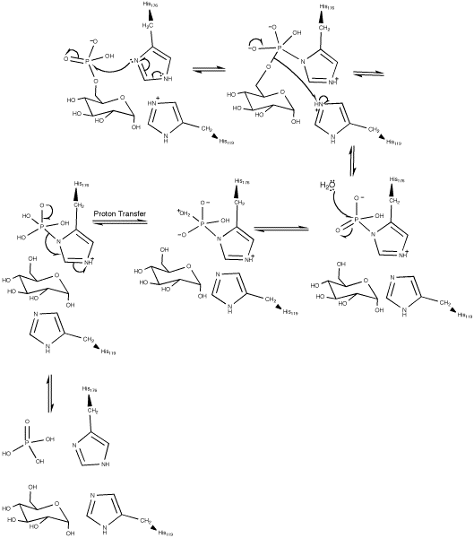 The hydrolysis of glucose-6-phosphate begins with a nucleophilic attack on the sugar-bound phosphate by His176 resulting in the formation of a phosphohistidine bond and the degradation of a carbonyl. A Negatively charged oxygen then transfers its electrons reforming a carbonyl and breaking its bond with glucose. The negatively charged glucose-bound oxygen is then protonated by His119 forming a free glucose. The phospho-intermediate produced by the reaction between His176 and the phosphate group is then broken by a hydrophilic attack; after the addition of another hydroxide and the decomposition of a carbonyl, the carbonyl is reformed kicking off the electrons originally donated by the His176 residue thereby creating a free phosphate group and completing the hydrolysis.[1]
