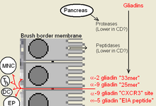 HLA-DQ proteins present polypeptide regions of proteins of about 9 amino acids and larger in size (10 to 14 residues in involved in binding is common for gliadin) to T lymphocytes.[16] Gliadin proteins can be adsorbed by APC. After digestion in the lysozomes of APCs, glaidin peptides can be recycled to the cell's surface bound to DQ, or they can be bound and presented directly from the cell surface.[17] The major source of inflammatory gluten is dietary gluten. Optimal reactivity of gliadin occurs when the protein is partially digested by small intestinal lysozyme and trypsin into proteolytic digests. These polypeptides of gluten can then make their way behind the epithelial layer of cells (membrane), where APCs and T-cells reside in the lamina propria. (See: Underlying conditions)