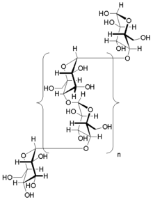 Glycogen is a branched biopolymer consisting of linear chains of glucose residues with further chains branching off every 8 to 12 glucoses or so. Glucoses are linked together linearly by α(1→4) glycosidic bonds from one glucose to the next. Branches are linked to the chains from which they are branching off by α(1→6) glycosidic bonds between the first glucose of the new branch and a glucose on the stem chain.[9]
