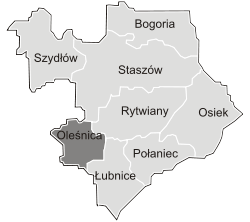 Gmina Oleśnica[2] is a rural gmina (administrative district) in Staszów County, Świętokrzyskie Voivodeship, in south-central Poland. Its seat is the village of Oleśnica, which lies approximately 15 kilometres (9 mi) south-west of Staszów and 58 km (36 mi) south-east of the regional capital Kielce.