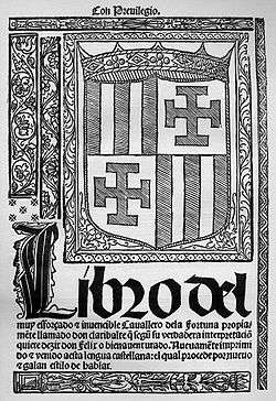 Oviedo's first literary work was a chivalric romance entitled, Libro del muy esforzado e invencible caballero Don Claribalte (Book of the very striving and invincible knight Don Claribalte). It was published in 1519 in Valencia by Juan Viñao, one of the prominent printers of that time. In the foreword, dedicated to Ferdinand of Aragón, Duke of Calabria (not to be confused with the King Ferdinand II of Aragon), Oviedo relates that the work had been conceived and written while he was in Santo Domingo. Therefore, it seems that this was the first literary work created in the New World.[1]