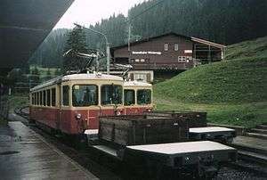 The Lauterbrunnen–Mürren mountain railway (German: Bergbahn Lauterbrunnen–Mürren, BLM) is a hybrid transport system in the Bernese Oberland area of Switzerland, which connects the villages of Lauterbrunnen and Mürren. The system consists of a connected aerial cableway, also known as the Grütschalpbahn, and an adhesion worked mountain railway.[1][2]