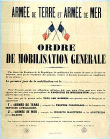 The French Chief of Staff, General Joseph Joffre, was convinced of the inevitability of the outbreak of the First World War and, on 30 July 1914, began organising the personnel for his GQG staff.[8] Joffre persuaded the French government to enact mobilisation on 1 August and at 14.00 the next day parliament, following the violation of the French borders by German military patrols, gave Joffre full wartime powers and activated the GQG.[8] The zone of army control was initially limited to just 8 departments of France, but on 10 August was expanded to 33 departments out of 86 in Metropolitan France.[9][10] In this area Joffre was the absolute authority and no civilian, not even President Poincaré or his ministers, could enter it without his permission.[11] Joffre used this authority to exclude the press and his own government's parliamentary commission on military affairs from his zone of control.[9]