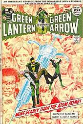 Green Arrow joined Hal Jordan in the main feature of the title in an acclaimed series of stories by writer Dennis O'Neil and artist Neal Adams beginning with issue #76 (April 1970) and ending with issue #122 (November 1979) that dealt with various social and political issues in which Green Arrow spoke for radical change while Green Lantern was an establishment conservative figure,[17] wanting to work within existing institutions of government and law. Where Oliver Queen advocated direct action, Hal Jordan wanted to work within the system; where Oliver advocated social change, Jordan was more concerned about dealing with criminals. Each would find their beliefs challenged by the other. Oliver convinced Jordan to see beyond his strict obedience to the Green Lantern Corps, to help those who were neglected or discriminated against. As O'Neil explained: "He would be a hot-tempered anarchist to contrast with the cerebral, sedate model citizen who was the Green Lantern."[18] The duo embarked on a quest to find America, witnessing the problems of corruption, racism, pollution, and overpopulation confronting the nation. O'Neil took on then-current events, such as the Manson Family cult murders, in issue #78 where Black Canary falls briefly under the spell of a false prophet who advocates violence.[19]