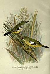 - ↑ Currie,AJ (1916). "The occurrence of the Green Munia Stictospiza formosa at Lahore". J. Bombay Nat. Hist. Soc. 24 (3): 594.