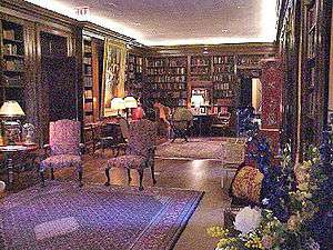 James Pinchot died in 1908, and his wife, Mary, died three days after Gifford married Cornelia Bryce in August 1914. He and his brother Amos split the estate, with Amos taking the half on which a small forester's cabin was the main dwelling and Gifford taking the house. The couple began spending their summers at Grey Towers. She realized that his developing political career, and hers (she ran for Congress three times),[15] required a residence more suited to entertaining guests than it had originally been intended to be, and set about modernizing the house. At her behest, many alterations were made to the original first-floor plan. The most significant involved merging the dining and breakfast rooms to create a large sitting room, and similarly enlarging the library by adding the living room to it. "The first thing my wife did", Pinchot told the Saturday Evening Post in 1922, "was to break down the partition walls and let in light and air ... [O]f course, it's a vast improvement."[7]