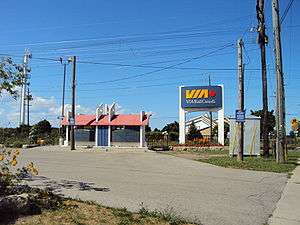 The original Great Western Railway station, built in 1853, is used by Fork Road Pottery.[1] It had also been used previously as a fruit depot and meat packing depot. The second GWR station burned down in 1900 and was replaced by a third in 1902.[2] That historic railway station building had two towers and was destroyed by an electrical fire in 1994.That building was concurrently in use as a restaurant between 1979 and 1994.[3] The current Via Rail shelter was built in the 1990s.