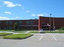 The regional school district was established in 1967[21] with the high school located on Main St. in Groton. In 1997, the school adopted 4x4 block scheduling.[22] In 1999, the "new gym" at the Main Street campus was renovated and renamed as the Peter Twomey Youth Center (PTYC) in order to honor a then recently deceased student. The PTYC is now "...a self-supporting facility that provides space for youth athletic leagues, adult education, and youth groups in Groton and Dunstable."[23] With the student population expanding from 370 in 1993[24] to its current levels, a new building was needed. In 2003 at cost of $35 million,[25] the high school relocated to its current location near the border between the two towns it serves.