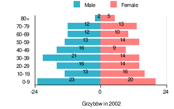 According to the 2002 Poland census, there were 243 people residing in Grzybów village, of whom 52.7% were male and 47.3% were female. In the village, the population was spread out with 26.7% under the age of 18, 33.7% from 18 to 44, 20.2% from 45 to 64, and 19.3% who were 65 years of age or older.[1]