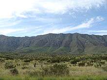 The Guadalupe Mountains reach their highest point at Guadalupe Peak, the highest point in Texas,[4] with an elevation of 8,751 feet (2,667 m).[5] The range lies southeast of the Sacramento Mountains and east of the Brokeoff Mountains. The mountain range extends north-northwest and northeast from Guadalupe Peak in Texas into New Mexico.[6] The northeastern extension ends about 10 miles (16 km) southwest of Carlsbad, near White's City and Carlsbad Caverns National Park; the southwest tip ends with El Capitan about 90 miles (140 km) east of El Paso. The mountains rise more than 3,000 feet (910 m) above the arid floor of the Chihuahuan Desert.[4] The Guadalupe Mountains are surrounded by the South Plains to the east and north, Delaware Mountains to the south, and Sacramento Mountains to the west.