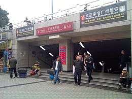 Guangzhou Railway Station Station (Chinese: 广州火车站) is an interchange station of Line 2 and Line 5 of the Guangzhou Metro.[1] It is located at the underground of the west square of Guangzhou Railway Station, located at the junction of Huanshi Road West (Chinese: 环市西路; pinyin: Huanshi Xilu and Renmin Road North (Chinese: 人民北路; pinyin: Renmin Beilu) in Yuexiu District. It started operations on December 29, 2002, (Line 2) and December 2009 (Line 5) respectively. Its area is about 10000 square metres and it is the second largest metro station in Guangzhou.[2][3][4]