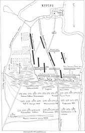 The field near Kortrijk was crossed by numerous ditches and streams dug by the Flemish as Philip's army assembled. Some drained from the river Leie or Lys, while others were concealed with dirt and branches, making it difficult for the French cavalry to charge the Flemish lines. The marshy ground also made the cavalry less efficient.[9] The French sent servants to place wood in the streams, but they were attacked before they completed their task. The Flemish placed themselves in a strong defensive position, in deeply stacked lines forming a square. The rear sides of the square were covered by a curve of the river Leie. The front sides presented a wedge to the French army and were placed behind larger rivulets. The large French infantry force led the attack, which initially went well and managed to cross the rivulets. Subsequently however, they failed to force back the Flemish front rows. The French commander Robert of Artois became impatient and recalled his foot soldiers to free the way to the noble cavalry. The cavalry were much hindered by the streams and ditches which the infantry had more easily negotiated in the beginning of the battle, and the disciplined Flemish infantry held firm. Unable at most points to break the Flemish line of pikemen, many French knights were knocked from their horses and killed with the goedendag, the spike of which was designed to penetrate the spaces between armour segments. Those cavalry groups that succeeded in breaking through were set upon by the reserve lines, surrounded and wiped out. To turn the tide of the battle de Artois ordered his cavalry reserves to continue the charges, with the same lack of success. When ultimately the French knights became aware that they could no longer be reinforced, their attacks faltered and they were gradually driven backwards into the rivulet marshes. There the disorganized, fallen, and mud-drowned French cavalry were an easy target for the heavily armed Flemish infantry. A desperate charge from the French garrison in the besieged castle was thwarted by a Flemish contingent specifically placed there for that task. The French infantry was visibly shaken by the sight of their knights being slaughtered and withdrew from the rivulets. The Flemish front ranks then charged forward, routing their opponents who were massacred. The surviving French fled, only to be pursued over 10 km (6 mi) by the Flemish.