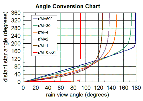 The impact parameter can be computed knowing the rain observer's r-coordinate and viewing angle . Then, the actual angle of the distant star, is determined by numerically integrating from to infinity. A chart of the sample results is shown at right.