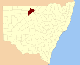 Gunderbooka County is one of the 141 Cadastral divisions of New South Wales. The Warrego River is the western boundary, and the Culgoa River and Darling River is the south-eastern boundary. It includes the area down to where the Warrego meets the Darling, to the north of Bourke (including North Bourke).