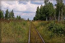 Gusevskoye peat railway emerged in the 1920s, in the area Gus-Khrustalny District, in a settlement named Gus-Khrustalny in 1931 became a town. The railway had a maximum length of about 100 kilometres (62 mi) at their peak.[1] Gusevskoye railway was built for hauling peat and workers and operates year-round with several pairs of trains a day. At present only 25 kilometres (16 mi) of the railway is operational, current operations include passenger traffic (workers-tourists) and freight traffic, transportation of peat. A peat briquette factory was built and put into operation in 2010 in a settlement named Gusevskiy.[2] A peat briquette factory was built and put into operation in 2011 in a settlement named Mezinovskiy.[3] About 2011 half of the railroad was dismantled. Formed two separate railway network.