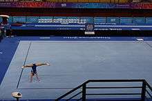 A gymnast competing in the floor exercise competition during the 2010 Summer Youth Olympics