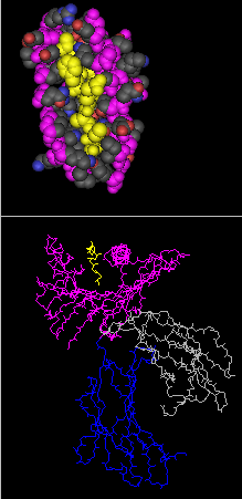 | Crystal Structure Of HlA-A2402 Complexed with a telomerase peptide PDB: 2BCK rendered with Cn3D!,space filling. Top panel - top down view of peptide (yellow) and HLA-A24 residues within 7 Angstroms of peptide. Bottom panel- side view peptide backbone with no side chains, peptide yellow, HLA-A magenta-blue, B2-microglobulin grey | ||