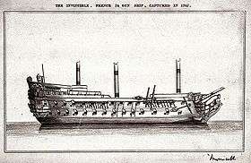 At the First Battle of Cape Finisterre (14 May 1747) during the War of the Austrian Succession, Invincible was escorting a convoy of merchant ships when she was sighted by the British channel fleet of 16 ships of the line, which gave chase. Invincible attacked the British ships to give the convoy a chance to escape, and alone engaged six British warships. In the end with most of her crew dead or wounded she struck her colours. Gracious in defeat, the French Commander, Saint-Georges, handed his sword to Admiral George Anson.