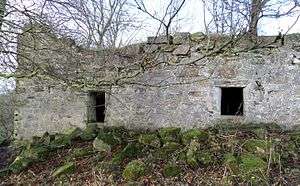 In 1930 the building is described as an 'Old World Mansion on the Cessnock' and it was entered via a tall arched entrance that was topped by a weather vane and flanked by two lions'.[28] It is referred to as 'Haining' or the 'Place of Haining' and a local tradition is recorded that Mary, Queen of Scots once stayed there.[28] The building had two storeys in 1930 with an outside set of steps giving access to the upper or first floor storey, whilst the lower three stone vaulted chambers were only in use as a store. The ground floor windows were narrow slits as the walls were as thick as an ancient keep. The writer speculates that the first floor was built upon a ruined keep and records that the outside steps appeared a 'restoration' addition and that a fanlight of many panes of glass existed above the entrance as found in very old houses. It is further speculated that, as the dwelling has little traditional history attached to it, it may have seen use as dower house to a nearby estate.[28]